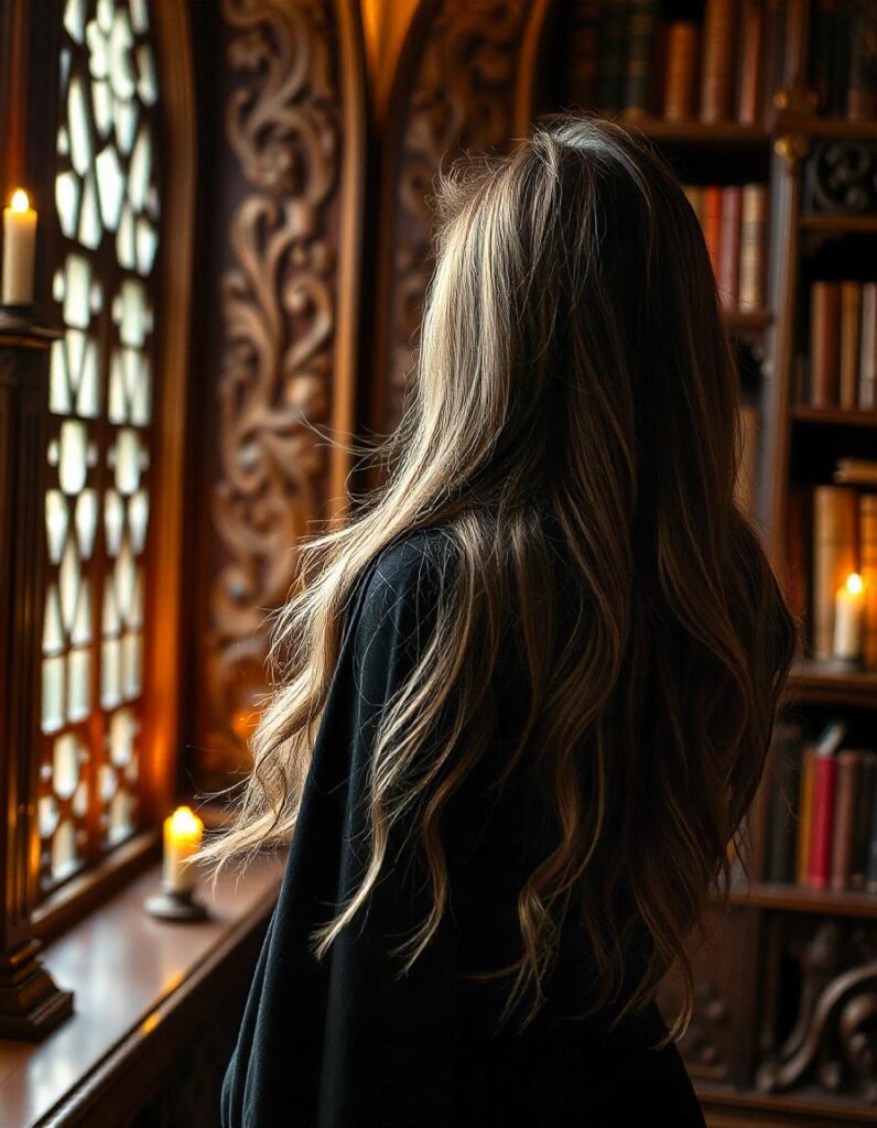 “Before you go, my lady,” he called out, his voice a whisper that seemed to carry in the quiet sanctum of the library. She stopped, her back to him, the tapestries of the ancients framing her silhouette. “Would you do me the kindness of sharing your name?”